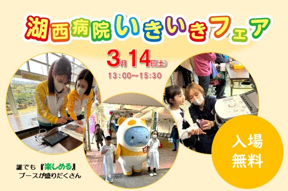 令和8年3月14日(土)湖西病院いきいきフェア開催します。 湖西病院いきいきフェアを開催します。 令和8年3月14日(土)、地域の皆さまとのつながりを深めるために湖西病院いきいきフェアを開催します。 病院のお仕事体験、血管年齢測定など大人も子供も楽しめるブースが盛りだくさん。 ぜひ、遊びに来てください。 いきいきフェア開催 いきいきフェアチラシ いきいきフェアチラシ いきいきフェアチラシ (PDF ファイル 5.21MB)